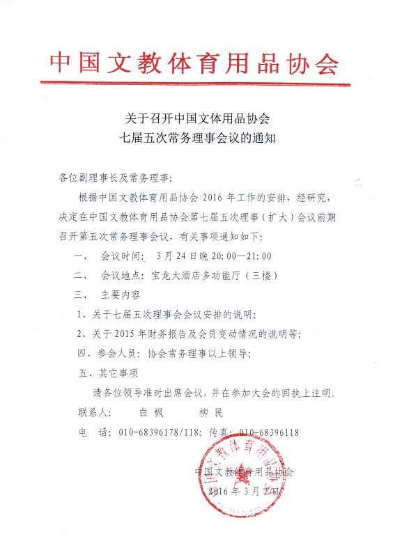 关于召开中国文体用品协会七届五次常务理事会议的通知