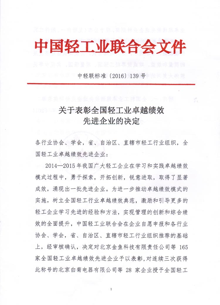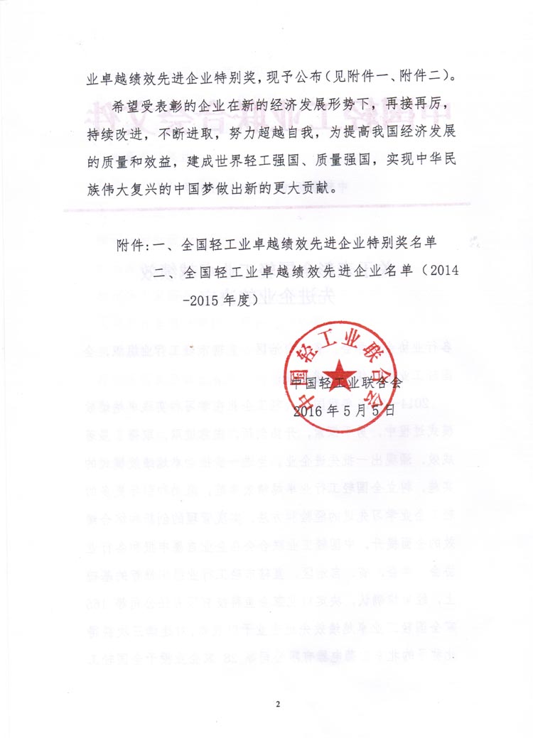 全国轻工业卓越绩效先进企业名单