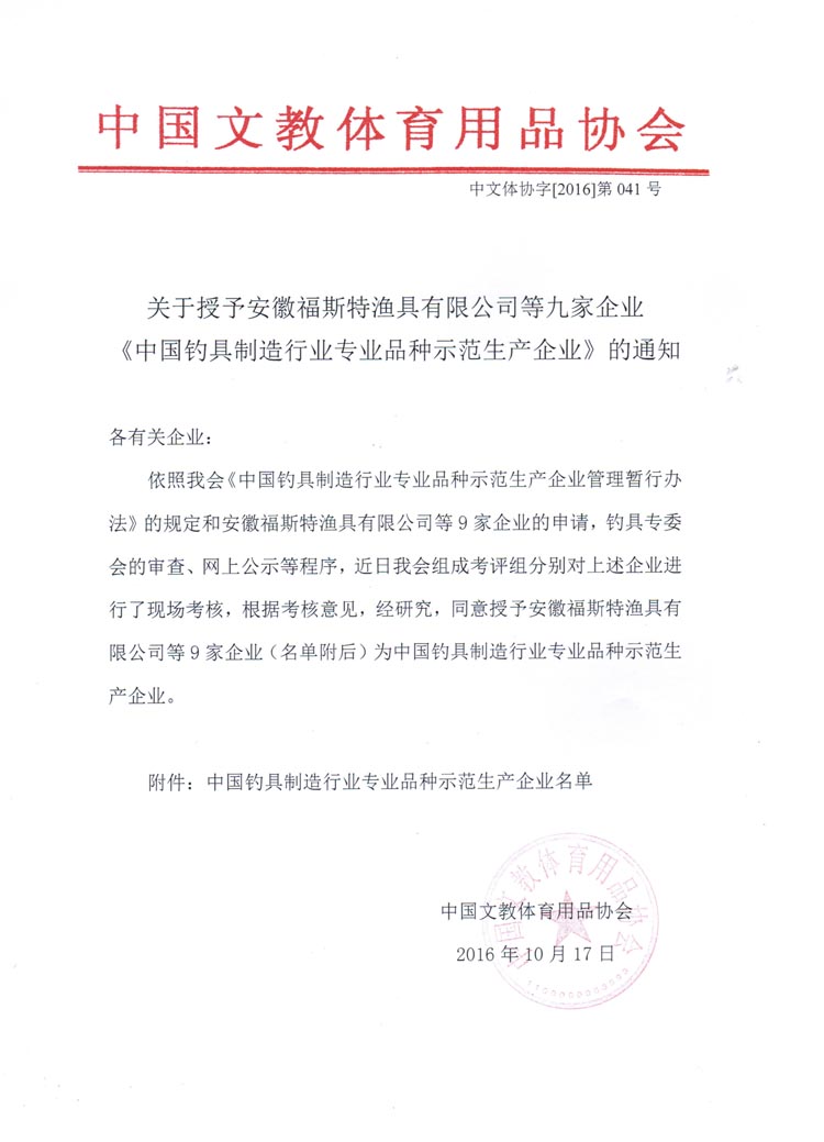 关于授予安徽福斯特渔具有限公司等九家企业《中国钓具制造行业专业品种示范生产企业》的通知