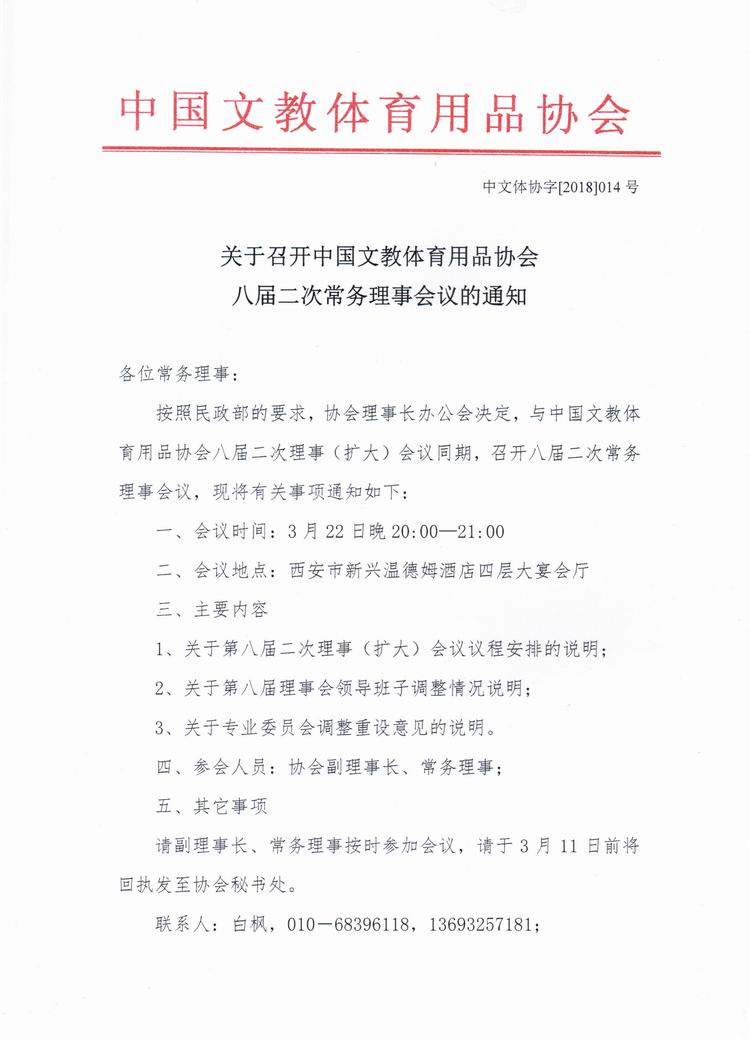 关于召开中国文体用品协会八届二次常务理事会议的通知